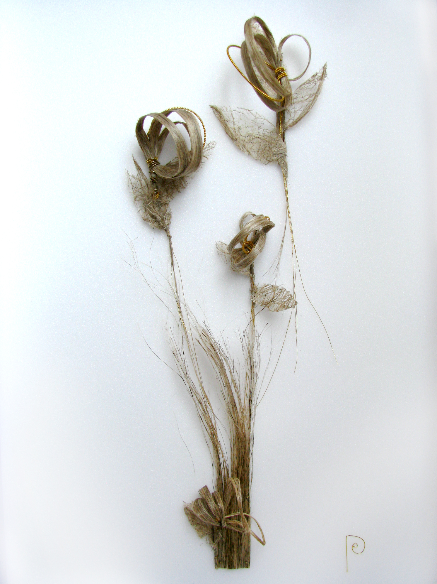 Pour répondre à la thématique du lin, je propose ici une exploration textile sculptée autour de la transformation de la filasse de lin, matériau brut et rustique, en une matière délicate et raffinée. La bourre filandreuse issue de la tige de la fleur de lin opère un retour à l’état d’entité végétale nouvelle et imaginaire.