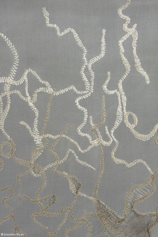 arborescence ( boutis sur voile de coton)bouillonné ( voile de coton )empreinte ( incrustation de mousseline de soie sur toile de coton) monogramme ( point de bourdon sur lettre de feutre)moisissure ( boutis sur voile de coton, perlage)lichen ( points de graines et application de pongée de soie enduit)écorce rouge ( bandes de velours de laine sur dentelle)mue ( épines de roses sur dentelle)semencedentelle ensemencée ( semences sur dentelle)tige piquante ( semence sur velours de laine) épines roses ( semence sur organza de soie)dentelle d'épines ( épines de dentelle et coton crocheté sur dentelle)toile ( brides au point de feston sur fils lancés)algue ( point d'ombre sur organdi de soie)dentelle végétale ( point de bourdon, techniques mixtes sur organdi de soie)moisissures ( inclusion de perles sur toile et voile de coton)écorce ( assemblage, voile de coton et inclusion de carton)racines ( point bourdon machine, fils de coton) Précédent Suivant